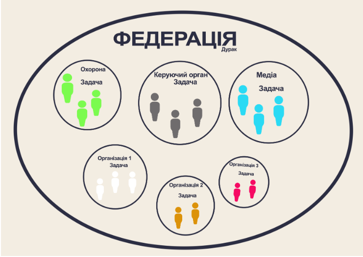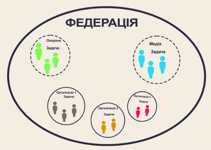 На Рисунку 20 зображена федерація з трьох автономних організацій, які спільно володіють загальним медійним ресурсом і охоронною організацією. Виконавці відділів «Медіа» та «Охорона» у федерації виступають делегатами з організацій 1, 2 і 3, а тому завдання для їхніх відділів формують безпосередньо всі співучасники федерації.