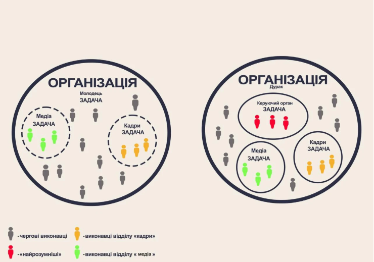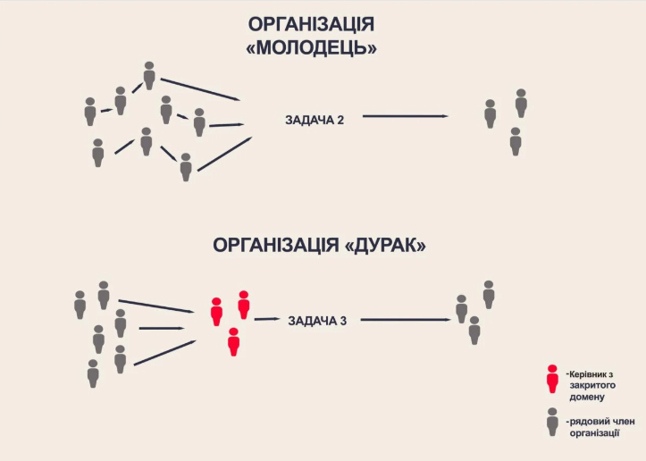 Схема організації «Молодець» — це взірець того, як повинна виглядати унітарна організація на основі прямої демократії. Усі домени організації повинні бути відкритими.