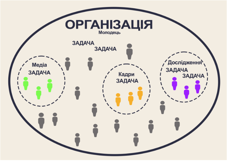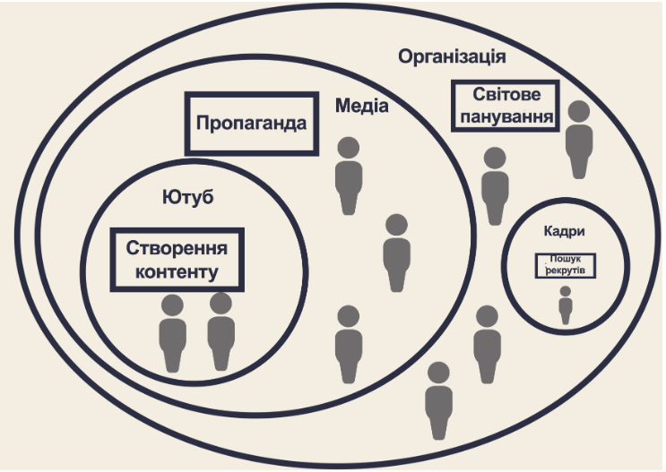 Відділи «Кадри» і «Медіа» спеціалізуються на конкретних аспектах, необхідних для досягнення загальних завдань, поставлених всією «Організацією». Кожен член відділу «Медіа» є виконавцем завдань «Організації» і «Медіа», але не «Кадрів». Відділ «Ютуб» спеціалізується ще глибше на завданнях, поставлених вже не тільки «Організацією», але і відділом «Медіа».