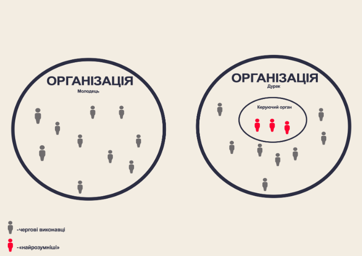 Подолається експлуатація. Жодне рішення не можна прийняти за спиною організації. Усі люди в такій системі вчаться керувати, а не тільки підкорятися.