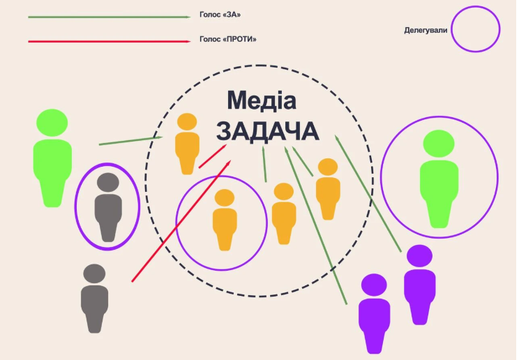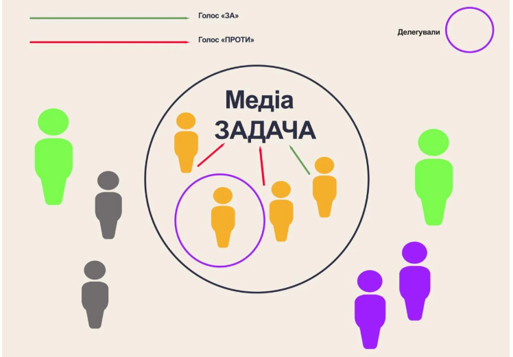 Кожен член організації має право відмовитися брати участь у формуванні будь-якого завдання, делегувавши це право всім іншим в рівній мірі (див. Рис. 13).