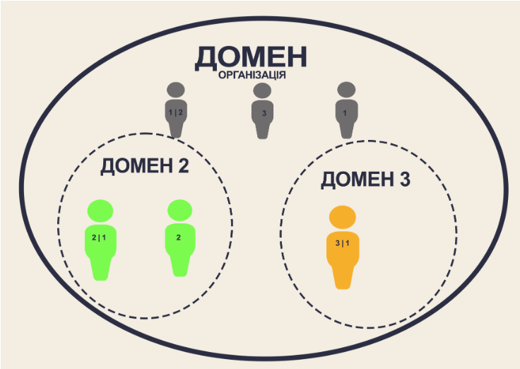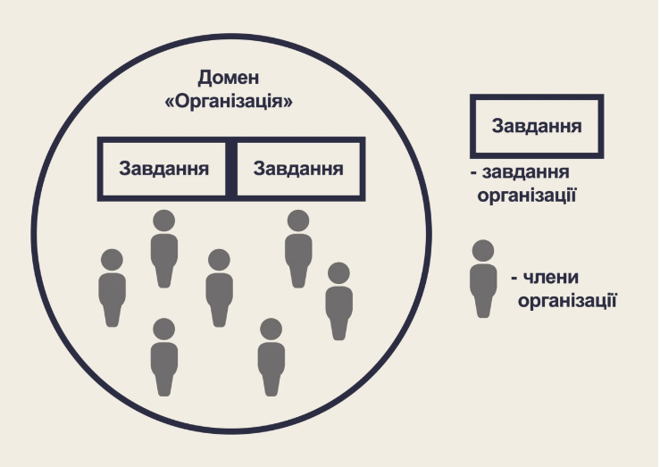 Наприклад (див. Рис. 4), домен «Організація» ставить глобальні завдання на рівні всієї організації. Усі члени організації виступають у ролі виконавців цих завдань.