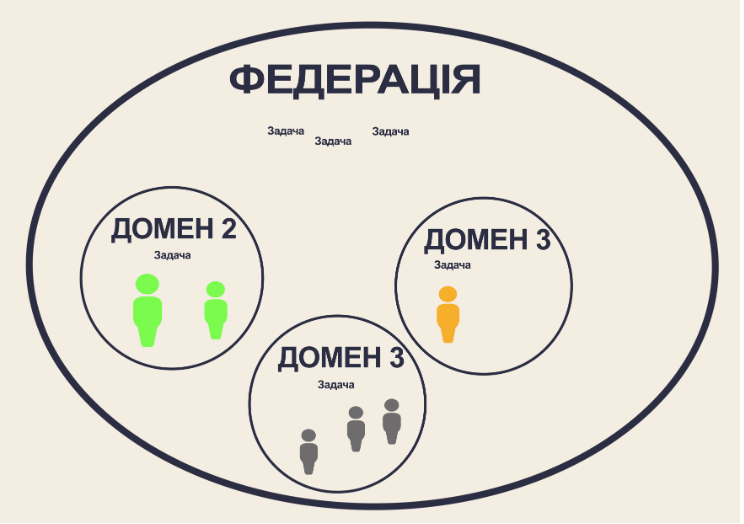 Принцип той самий. Усі члени Федерації 1 на рівних беруть участь у формуванні та вирішенні її завдань. Завдання Федерації 2 і Федерації 3 формуються тільки членами відповідних федерацій. А домени управляються автономно.