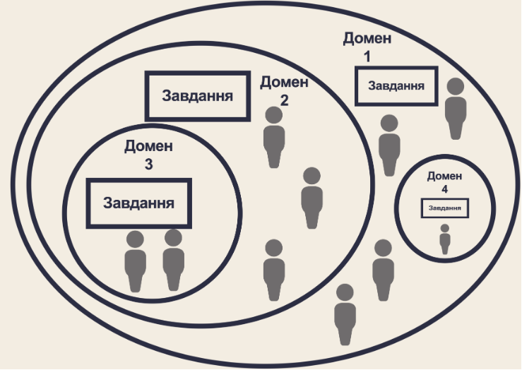 Вище ми розглянули максимально спрощений приклад організації. Вона зібрана з людей однієї спеціальності під спільне рішення одного типу завдань. Тепер додамо різноманітності і змоделюємо організацію, що включає в себе кілька відділів (доменів), в яких конкретні фахівці виконують різнопланові завдання.